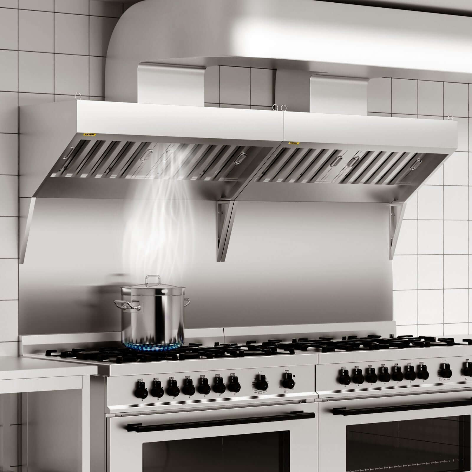 Commercial Exhaust Hood 5FT in stainless steel with oil filters, installed in a professional kitchen over a stove with steam rising.
