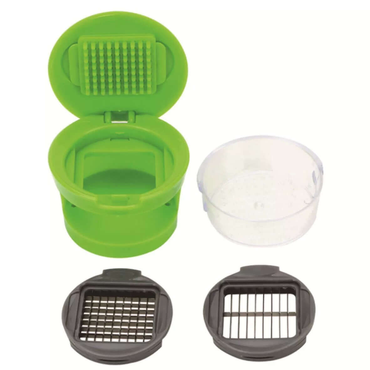 Green kitchen tool with a grid slicer attachment for efficient vegetable and garlic mincing.
