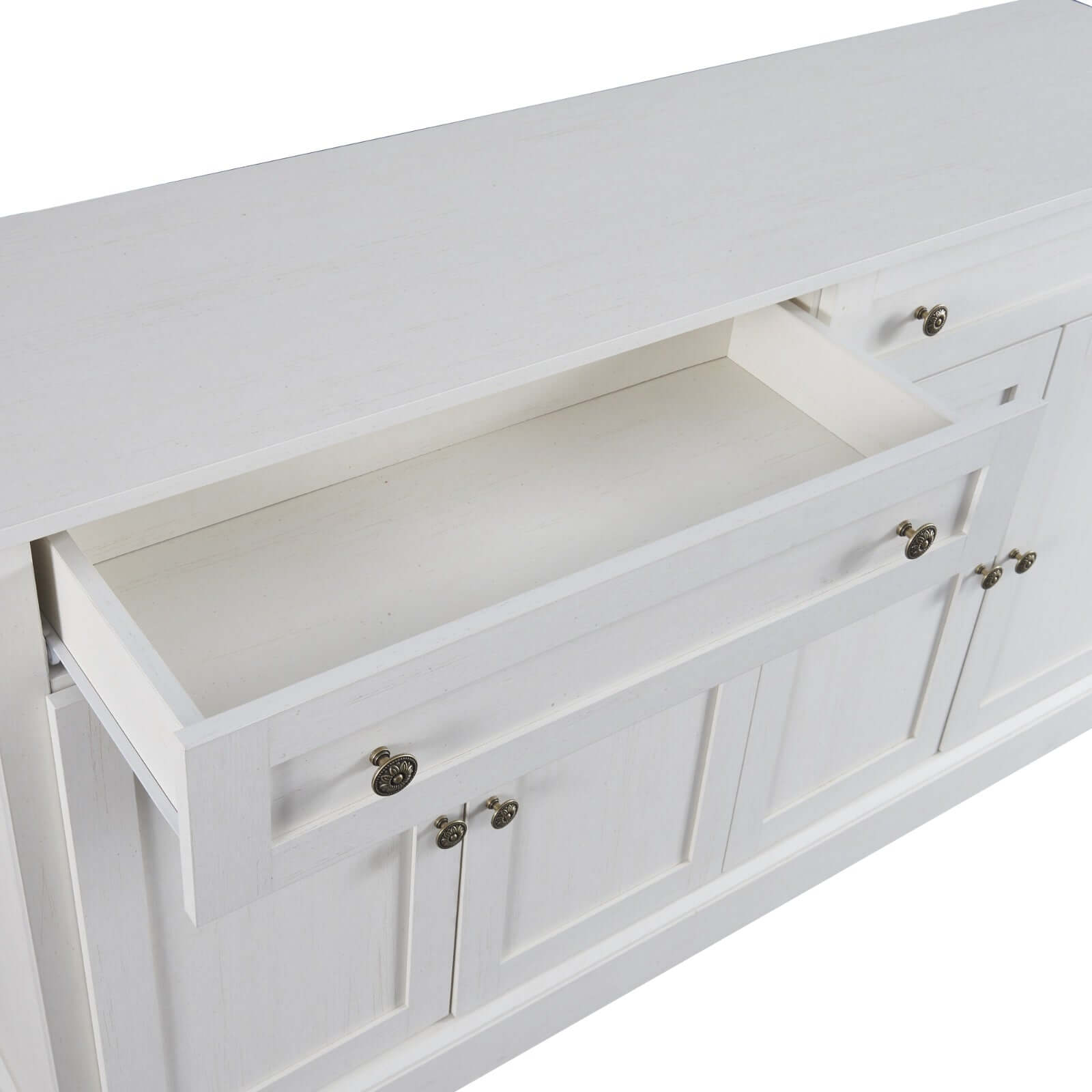 TREXM Kitchen Buffet Cabinet in antique white with open drawer showcasing storage space and elegant design.