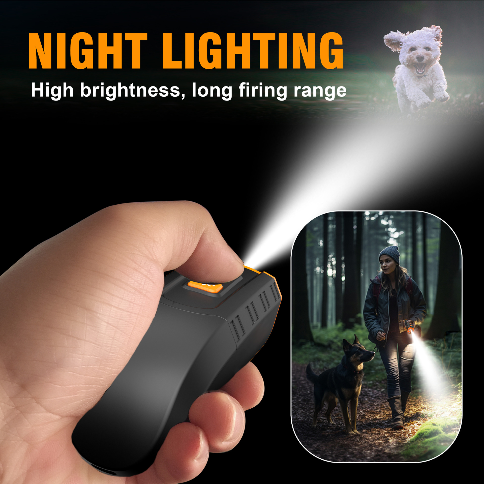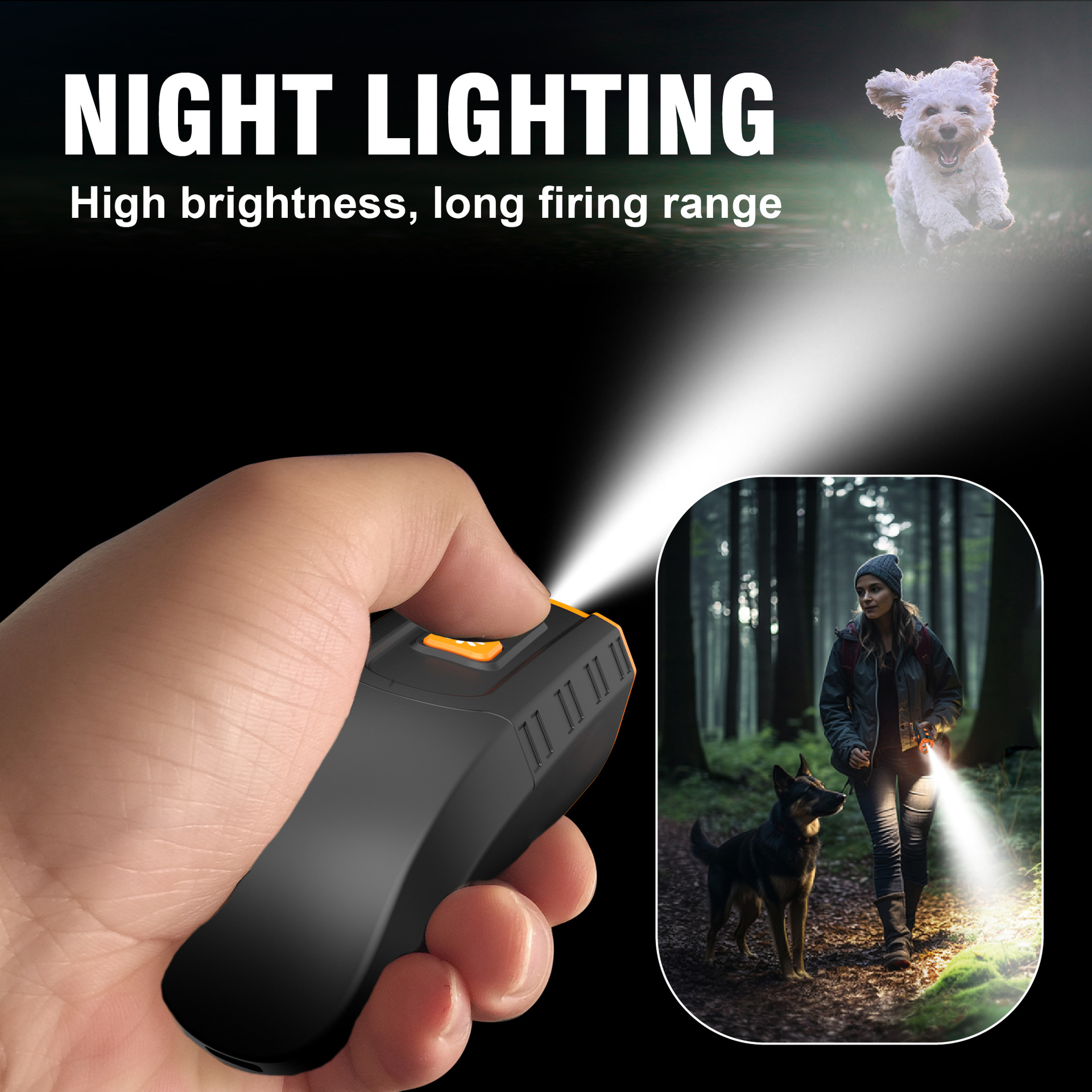 Flashlight Feature: Includes a strobe light for additional deterrence.