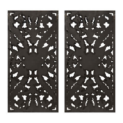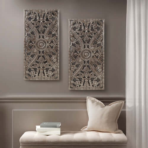 Bring timeless elegance and character to your home with the Rustic Wood Wall Decor Set. This 2-piece panel collection features beautifully distressed carved designs, adding warmth and sophistication to any room. Crafted from durable MDF, each wall art panel showcases a lotus flower pattern finished in bronze with silver distressing, giving it a unique rustic and antique appeal.