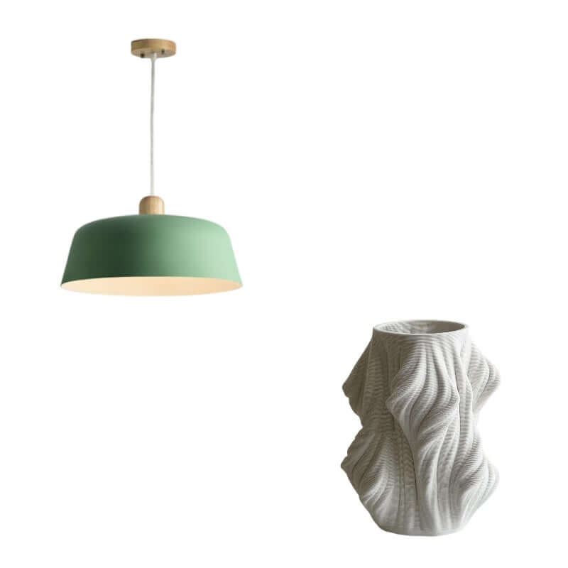 Nordic Wood Pendant Light in green beside a textured white vase, showcasing modern home décor style.