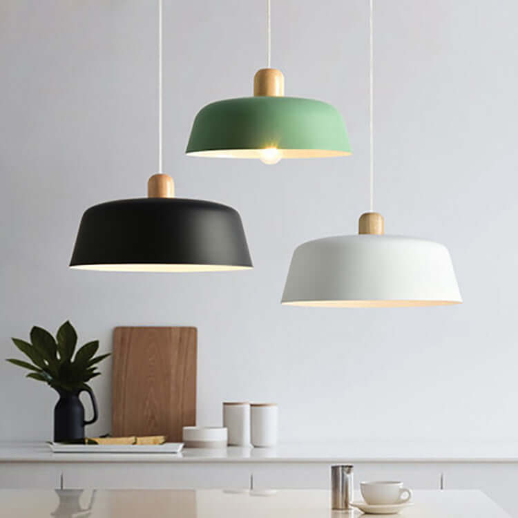 Nordic Wood Pendant Light in black, green, and white over a kitchen counter for modern home décor.