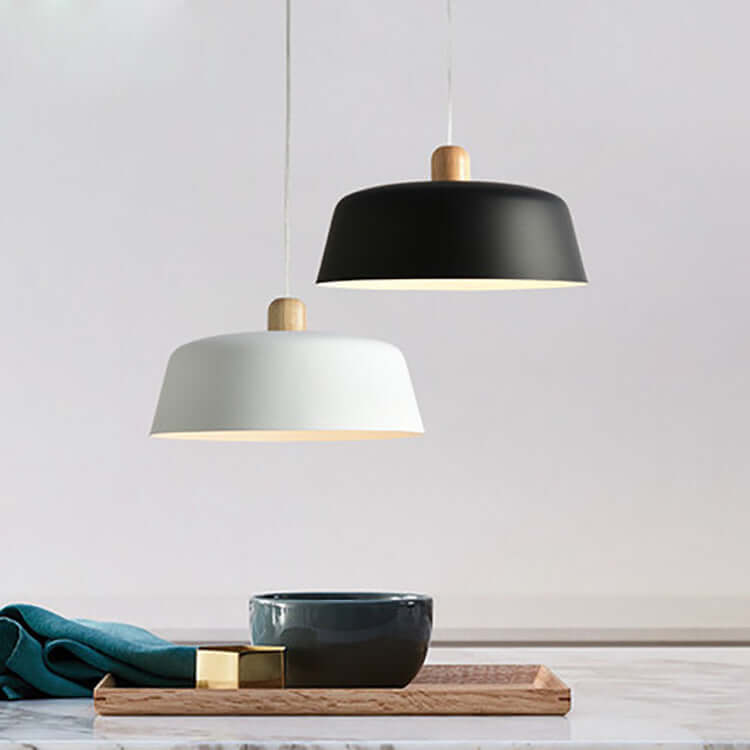Nordic Wood Pendant Light - Modern round hanging lamp in black and white, ideal for stylish home décor, adjustable height.