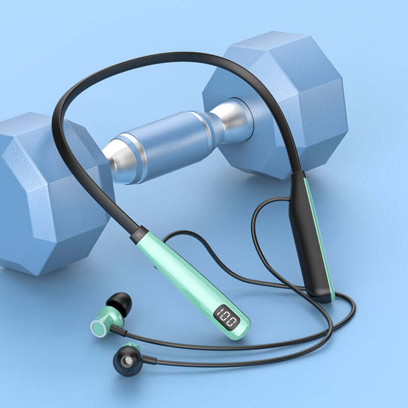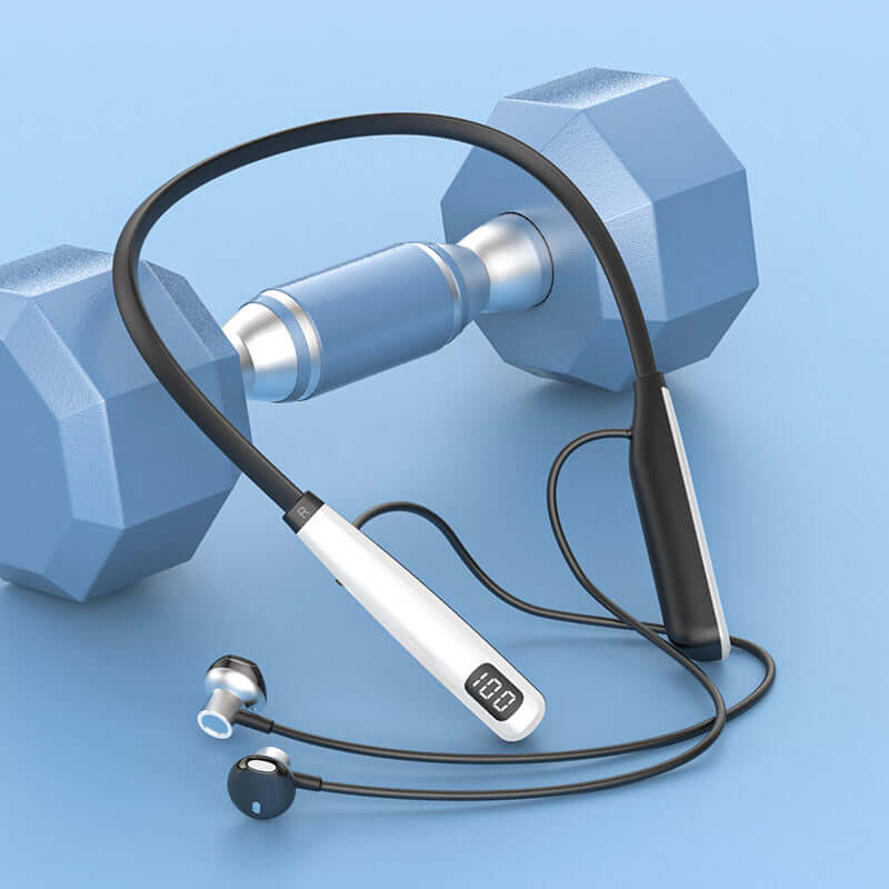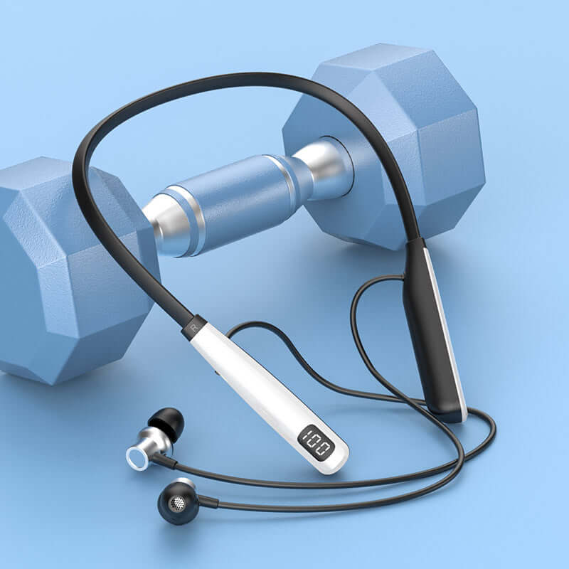 Wireless Bluetooth 5.4 Neckband Headset for sports with dumbbell in background