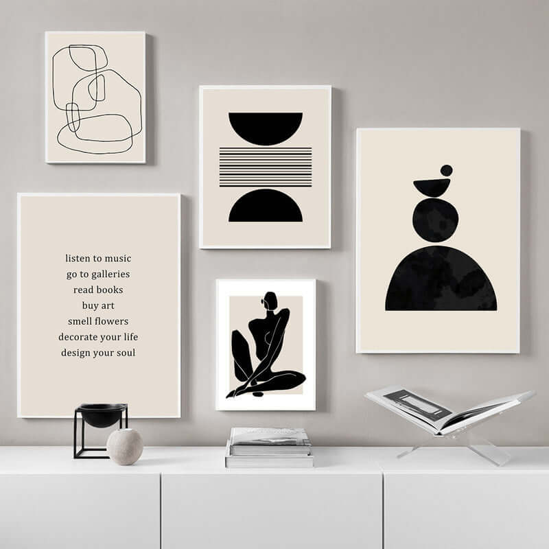 Bohemian Abstract Art Poster set for modern airbrushed living room decor, featuring black and beige geometric designs.