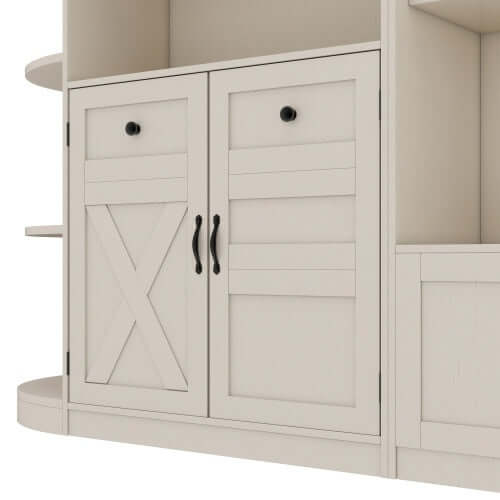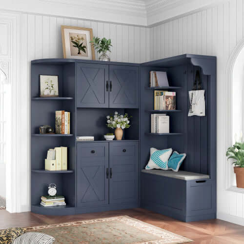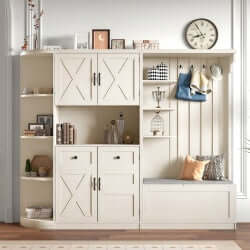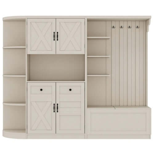 - [Grand espace de rangement] Les armoires d'entrée gauche et droite peuvent non seulement servir de rangement, mais aussi de portemanteau. L'armoire de gauche comporte 5 étagères ouvertes et 2 placards en haut et en bas ; l'armoire de droite comporte 3 étagères ouvertes et une étagère rabattable dissimulée, ainsi que 4 crochets pour suspendre vêtements et sacs. Elle peut accueillir divers articles ménagers et garder la pièce propre et bien rangée.