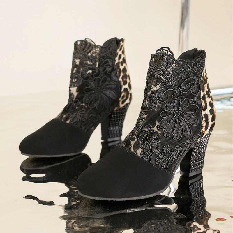 Lace Mesh High Heel Sandals – Round Toe Thick Heel