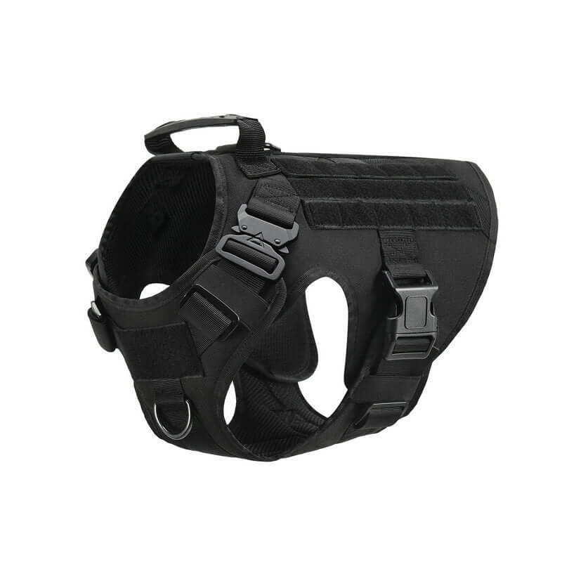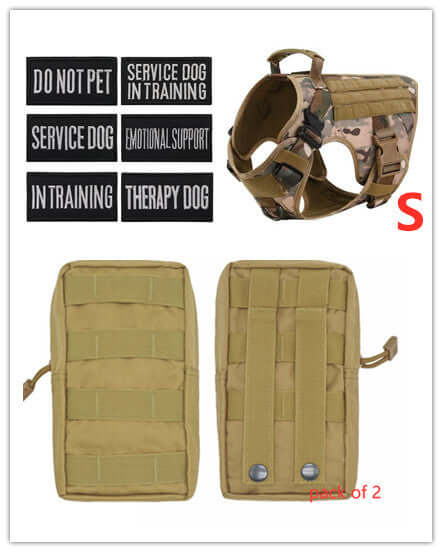 • Designed with MOLLE tactical equipment systems, this Military Tactical Dog Harness includes pockets and side attachments for carrying water bottles, gear, or accessories. It also features multiple hook and loop panels for morale patches or ID badges — allowing you to personalize your dog’s look.