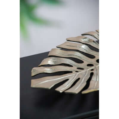 Modern Gold Metal Wall Art – Monstera Leaf decorative piece on wooden table.